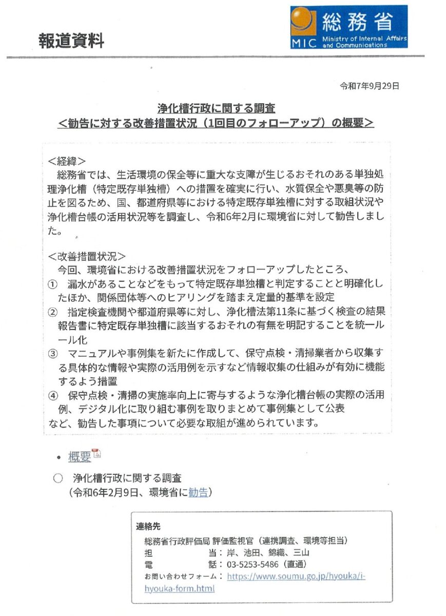(報道発表)総務省「浄化槽行政に関する調査」フォローアップについて(お知らせ)