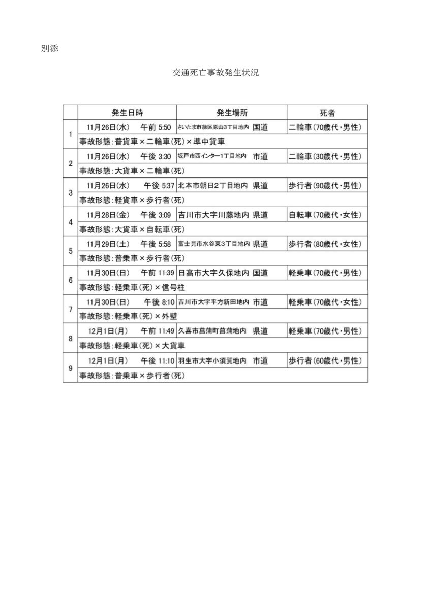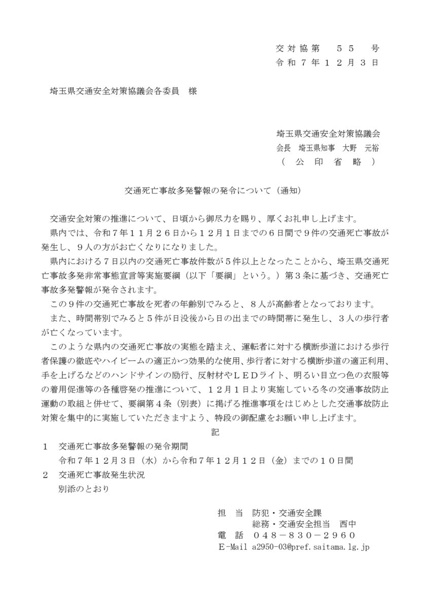 県内では、12月1日から冬の交通事故防止運動期間中となりますが、11月26日から12月1日までの6日間に9件の交通死亡事故が発生したことから、県から交通死亡事故多発警報が発令されました。発令期間は、令和7年12月3日(水)から同年12月12日(金)までの間となります。交通事故防止対策を推進していただきますようご協力をお願いいたします。